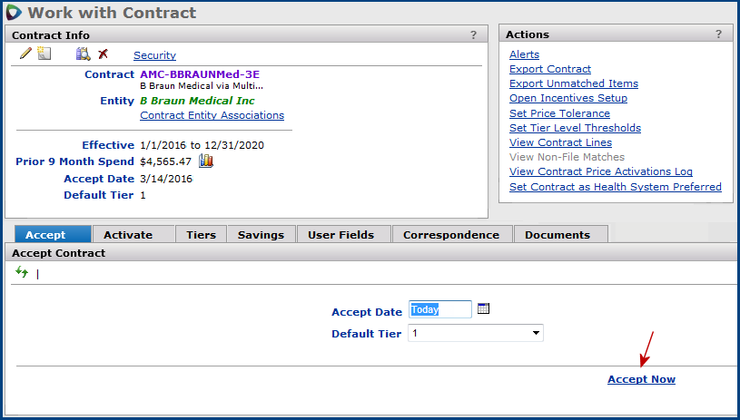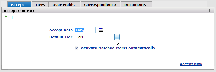 Lets you accept a contract Figure 3. You must accept the contract before you activate prices (unless you are using auto activation). Until a contract is accepted, you can only view documents for the contract.