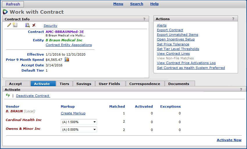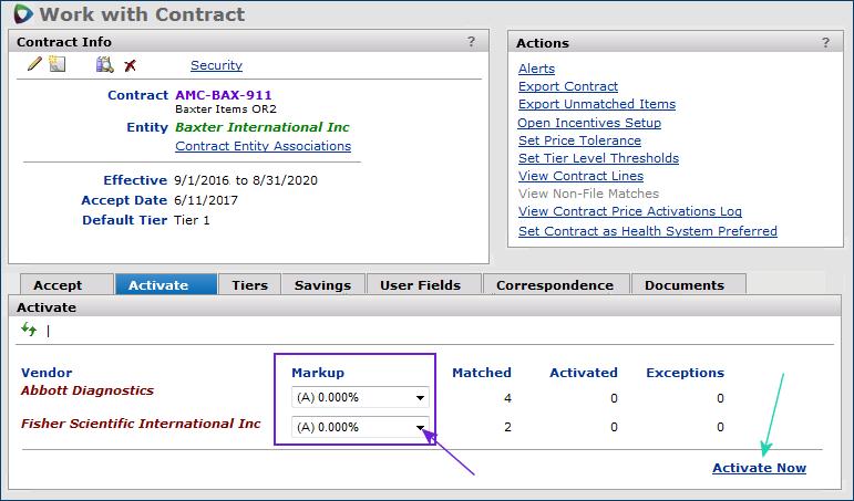 Activating a contract involves selecting individual vendors (or all vendors) whose prices you wish to use. Typically, you must also include vendor markup percents or amounts when selecting vendors to activate.