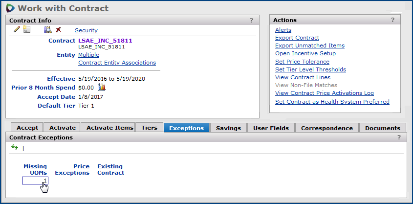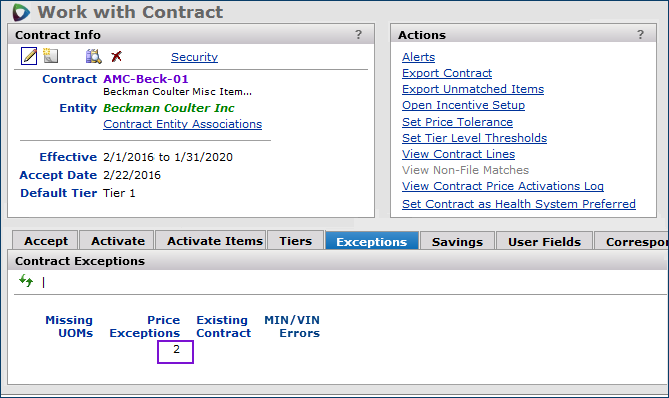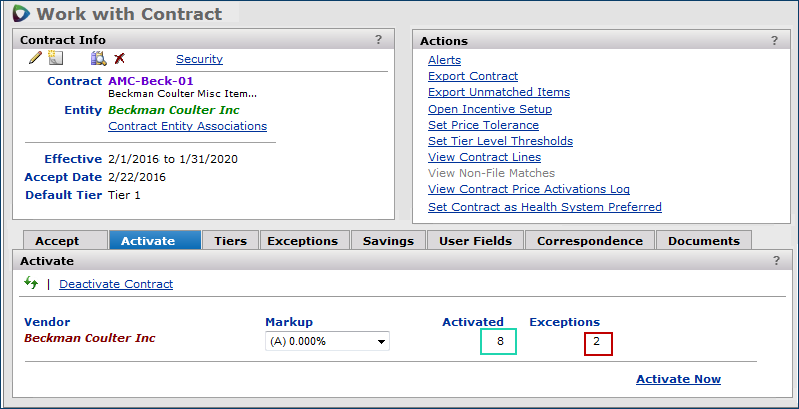 Note: When a contract is uploaded and all of its prices are expired, the contract no longer appears for activation on the Accept/Activate Contracts panel. When all prices on a contract are expired, on the Accept/Activate Contracts panel you can only accept the contract, or identify a missing entity. The Activate link does not appear. You cannot activate expired contract items.