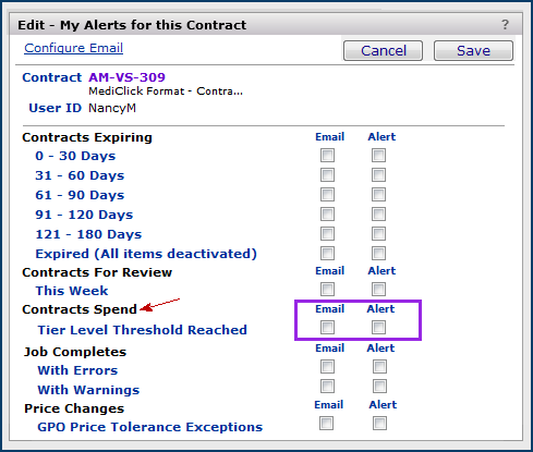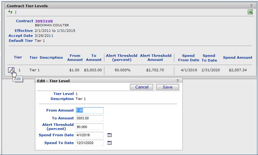 You can also set an alert to notify you when spend reaches a specified percent of the upper tier limit's dollars.Note: The Contract Template also provides space for entering tier information when you import a contract or when you award a contract to a bid in an analysis project.