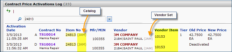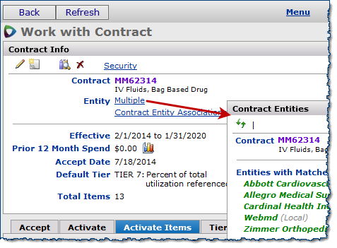 With the Product Index Layer, each vendor buy-from location, for contract activation purposes, is "rolled up" to the vendor level. For example, if you have multiple Ethicon buy-from locations, all of the locations are under the Ethicon vendor umbrella. Activation occurs for the vendor entity. When you activate a contract, you will see that the vendor entity associated with Ethicon -- Johnson & Johnson -- appears.