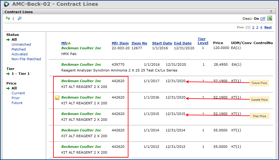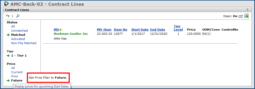 You can also select filters for the contract lines based on Status (All, Unmatched, Matched, Activated, or Non-File Matched) or Price (All, Current, Prior, or Future).