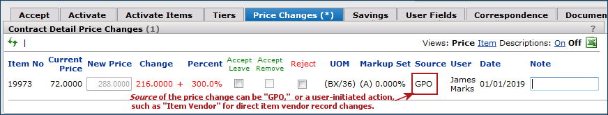 A GPO price change contains the Source value "GPO."