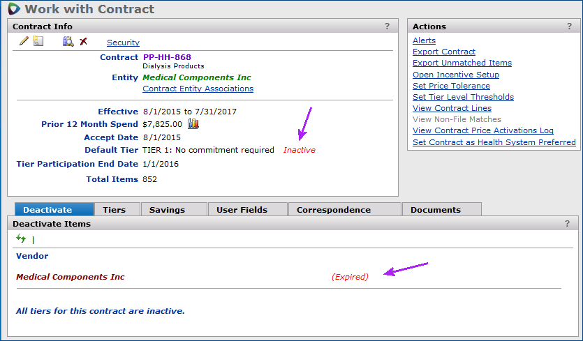 When a contract expires, an automated process deactivates all its items; except: any items with pending price changes do remain activated. You can set an alert (Expired - All items deactivated) to notify you that a contract expired. For supply contracts, the alert also flags any problems in deactivating items. The section below describes the error messages you may receive.