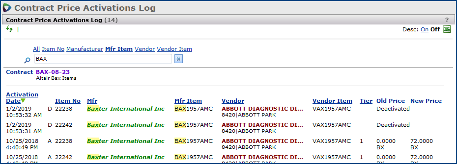 The Contract Price Activations Log appears. The view that you see will differ depending on whether you have accessed the Price Activations Log via the Work with Contract panel (see Figure 51) or via the Administration menu (see Figure 52).