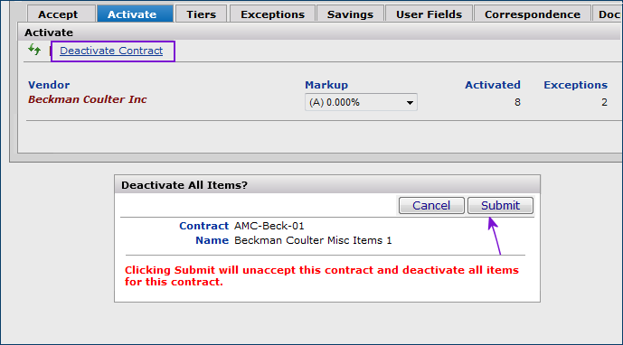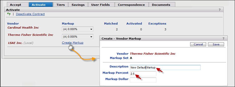 When you activate items, you need to include any vendor markup on the contract prices. (Vendor markup can be zero.) If vendor markup has not been set, you need to enter it.