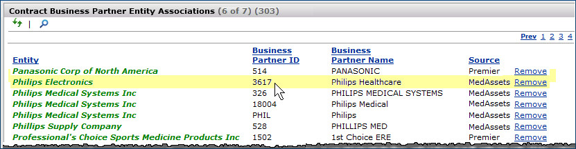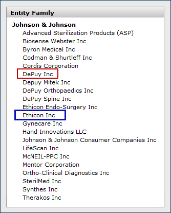 Vendors (and manufacturers) are associated with entity families in the Product Index Layer. Associating a vendor with an entity family "registers" the vendor. Registering a vendor lets the PIL recognize the vendor's items that match a contract so that you can activate the prices. For example (Figure 1), the vendor DePuy Inc. belongs to the Johnson & Johnson family. DePuy is registered to the entity Johnson & Johnson. Ethicon also belongs to the Johnson and Johnson family.