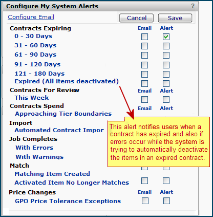 The system alert Expired (All items deactivated) can be set to notify users that the contract expired (Figure 62). For supply contracts, the notice also flags any problems in deactivating items. (Deactivation does not occur with services contracts.) Changes cannot be made to items on an expired contract. (See Alerts and notifications for details on setting alerts.)