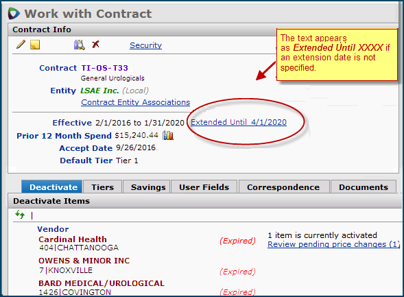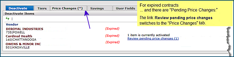 When an expired contract has pending, user-initiated item vendor price changes, the link Review pending price changes appears next to the relevant contract vendor (Figure 61). Clicking the link opens the Price Changes tab.
