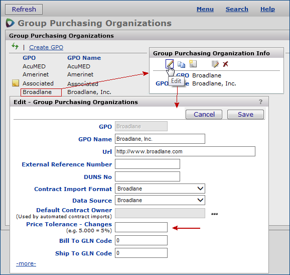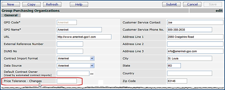 Sourcing and Contract Management uses a GPO Tolerance to compare the current price of activated items to re-imported GPO contract prices for those items. If the new price is out of tolerance, a price change is flagged on the Price Changes panel.