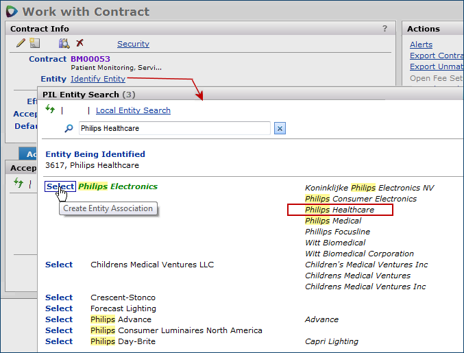 If the system cannot identify a contract's manufacturer entity, a link appears next to the contract name: Identify Entity. Click the link to locate and designate the manufacturer entity.