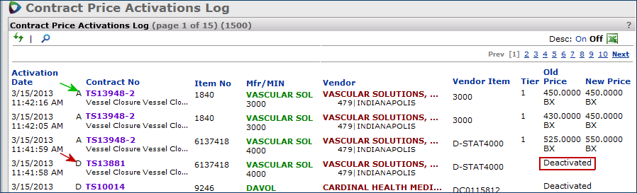 Activating contract prices writes the prices to a site's materials management item master file. The items are then available for purchase, at the contract price, on the date that the price is effective. You can activate both local and -managed contracts.