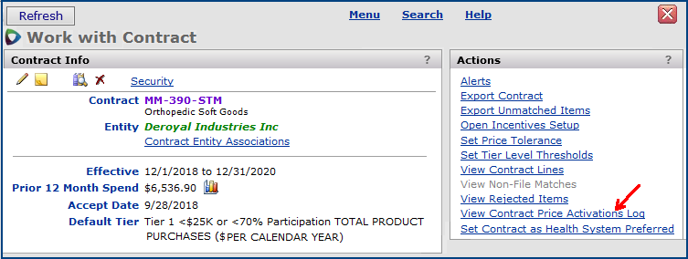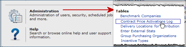 The Contract Price Activations Log is a single, searchable list of price activations for all contracts. The Contract Price Activations Log panel is available from the actions panel of the Work With Contract page, and also through the Administration menu.