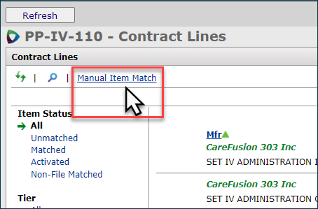 The Manual Item Match for a contract can be accessed through any of these paths: