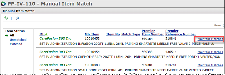 | Activate tab > | Manual Item Match > | Maintain Matches | |