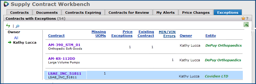 You can filter the list by Owner for your contracts only, all contracts, or unassigned contracts.