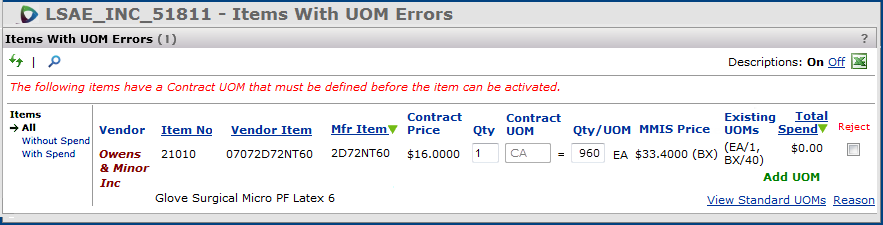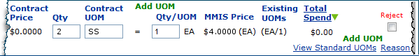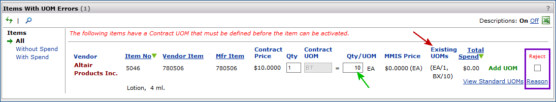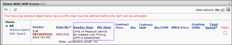 You are rejecting the item for a vendor for the contract you are currently working with. This will prevent the item from ever activating on this contract. You are not rejecting a price in this case because the price can’t be calculated properly due to the UOM error.