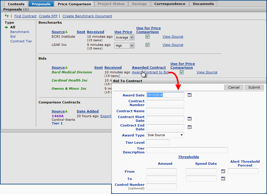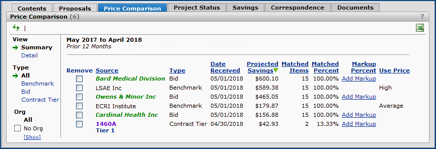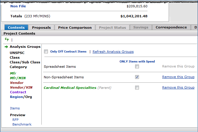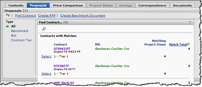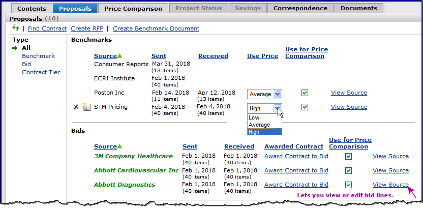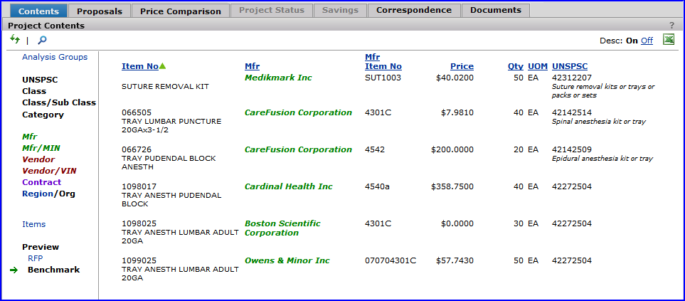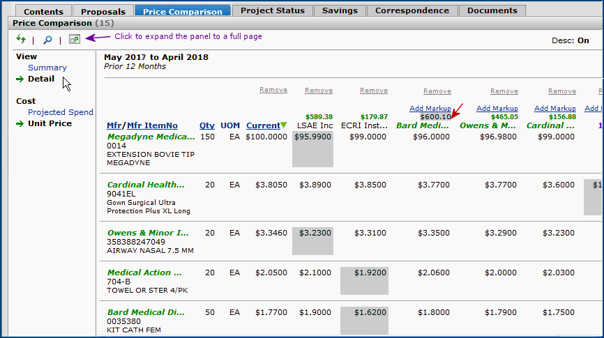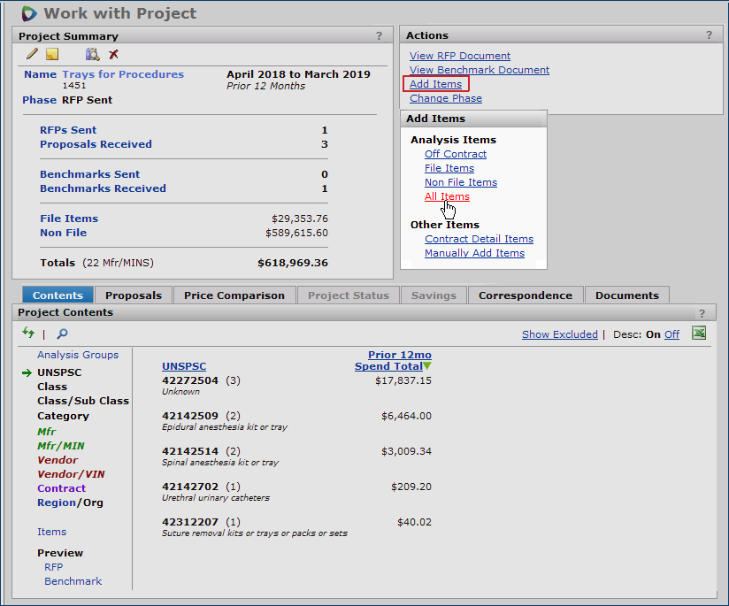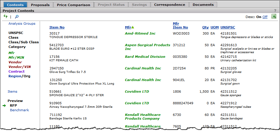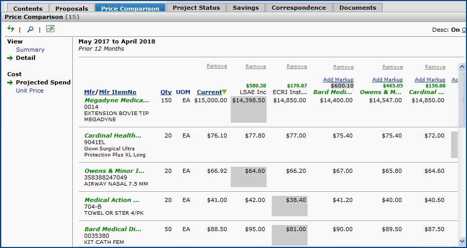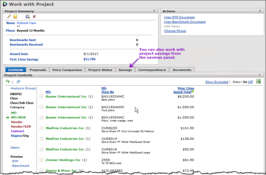 The Projects feature lets you segment and study spend, create and send RFPs (requests for proposals) for better pricing, and upload returned bids. You can review and compare returned bids, benchmark prices, and current prices. (Price comparison is available on several levels, including total dollars and item dollars.) You can award contracts to bids, then track savings on project items purchased on the contracts.