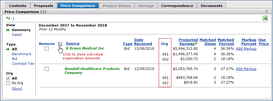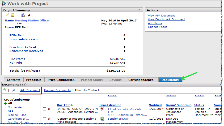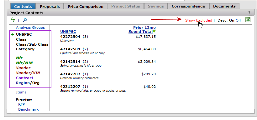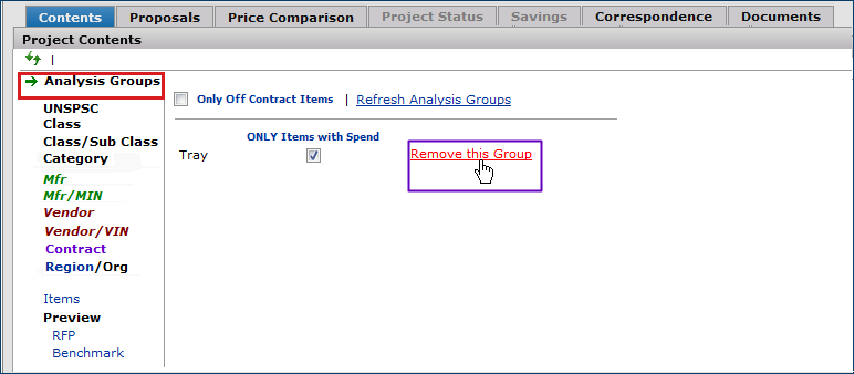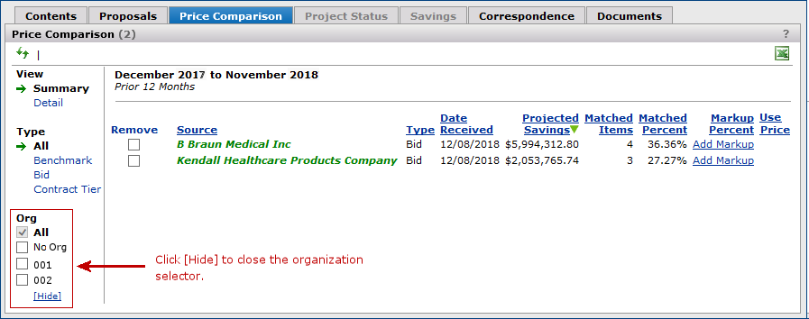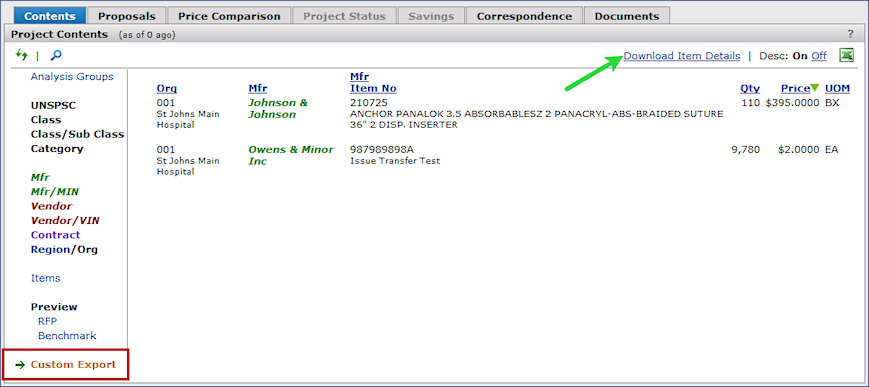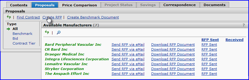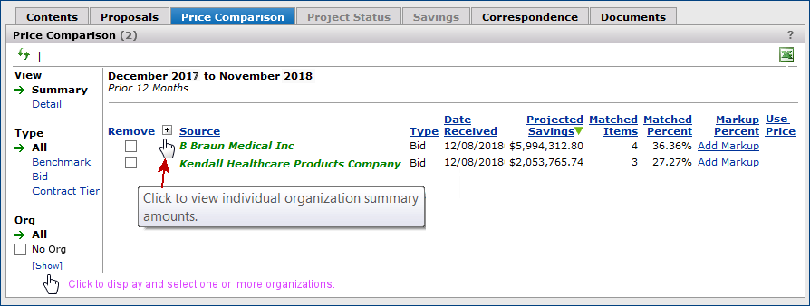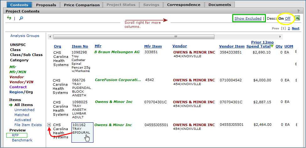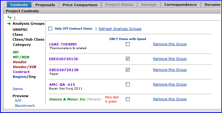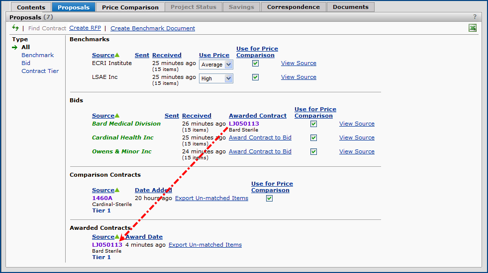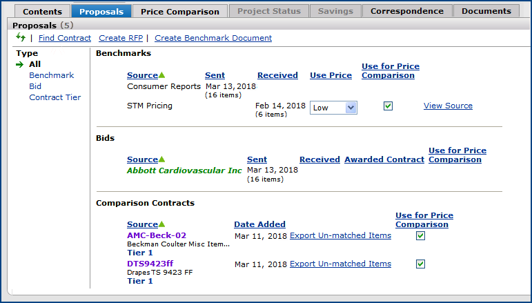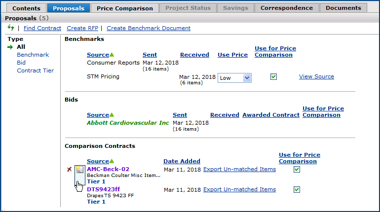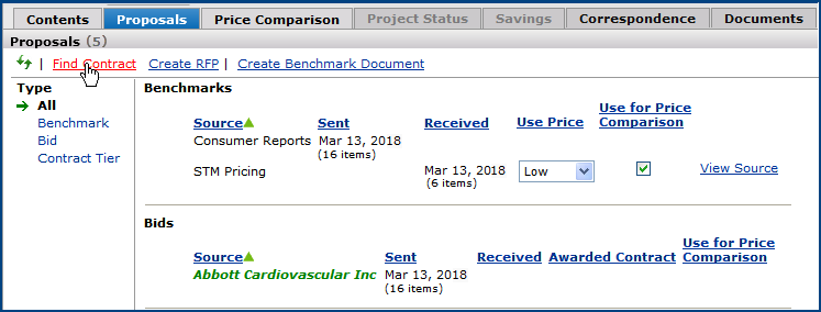 The Projects feature lets you segment and study spend, create and send RFPs (requests for proposals) for better pricing, and upload returned bids. You can review and compare returned bids, benchmark prices, and current prices. (Price comparison is available on several levels, including total dollars and item dollars.) You can award contracts to bids, then track savings on project items purchased on the contracts.