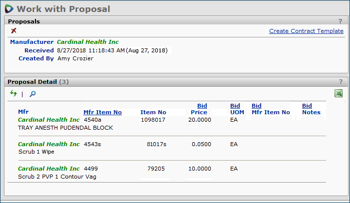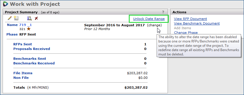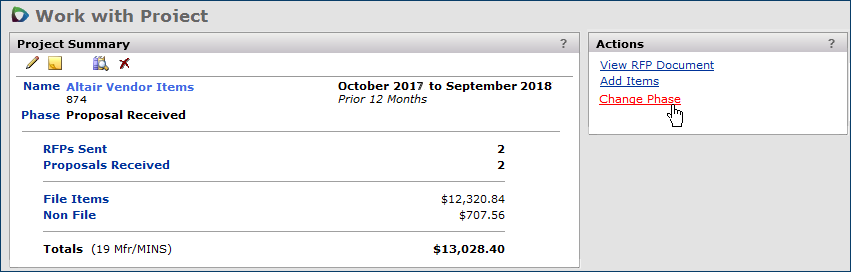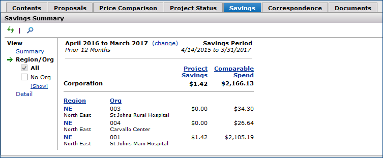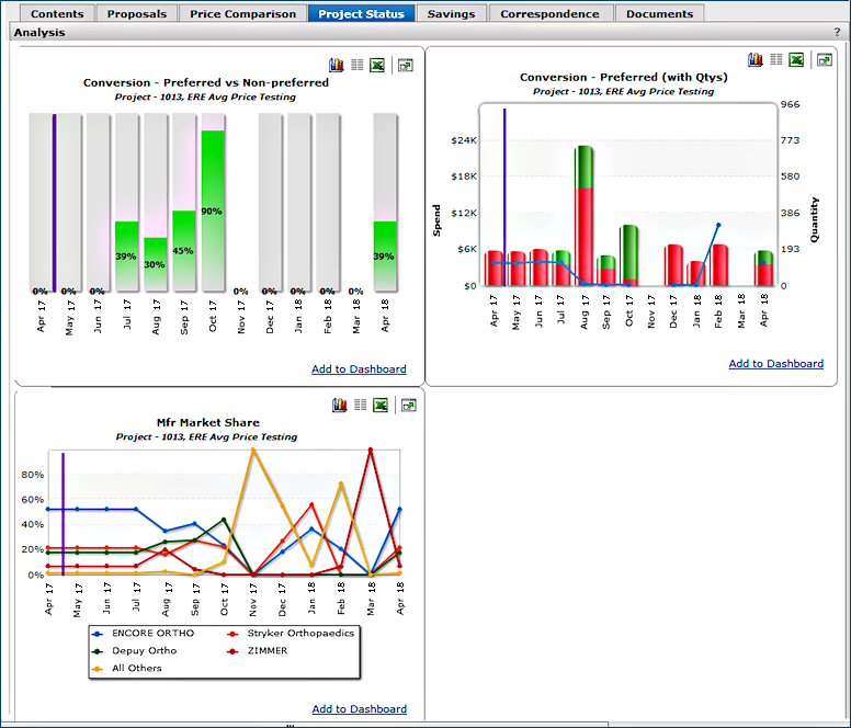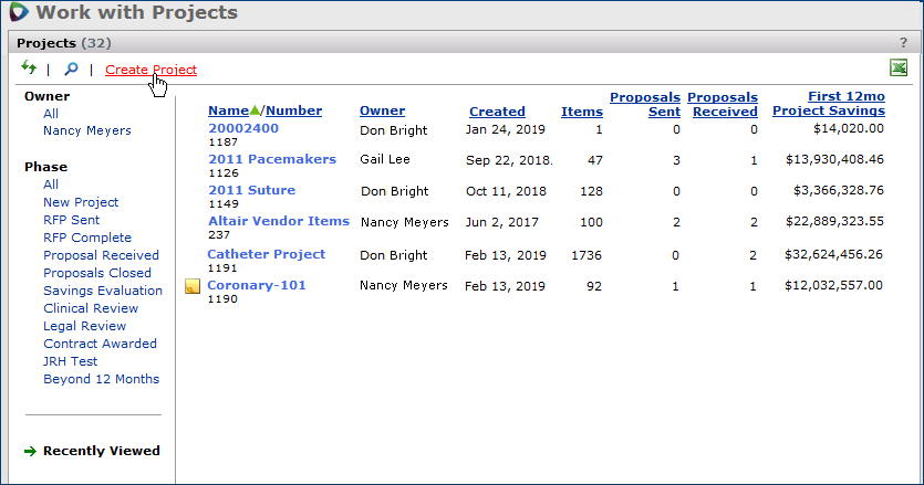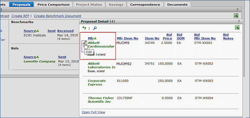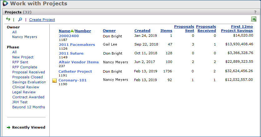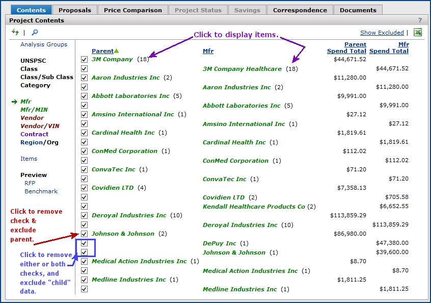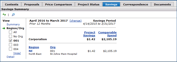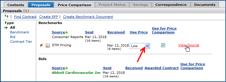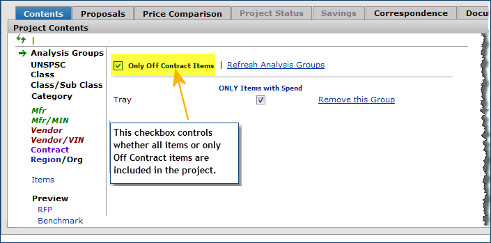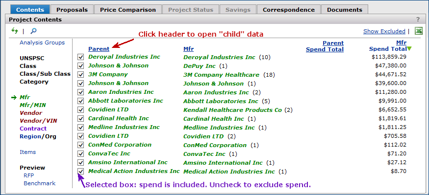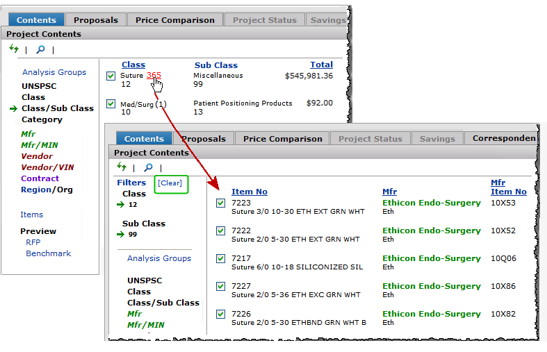 The Projects feature lets you segment and study spend, create and send RFPs (requests for proposals) for better pricing, and upload returned bids. You can review and compare returned bids, benchmark prices, and current prices. (Price comparison is available on several levels, including total dollars and item dollars.) You can award contracts to bids, then track savings on project items purchased on the contracts.