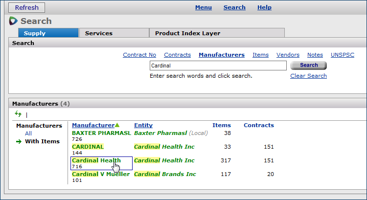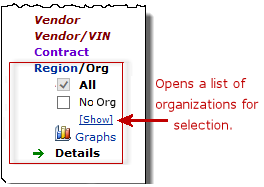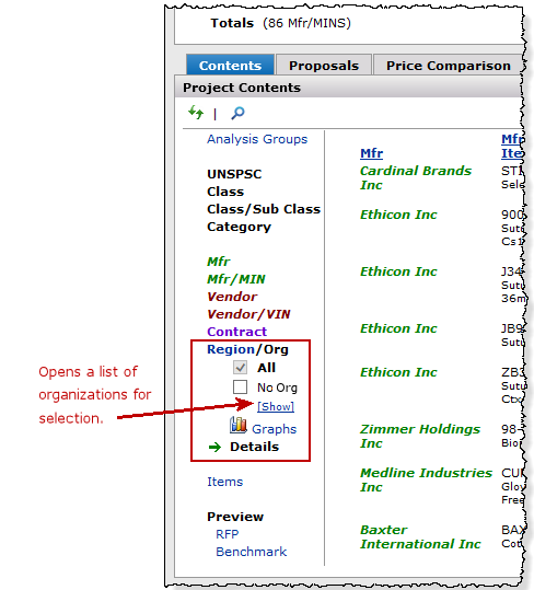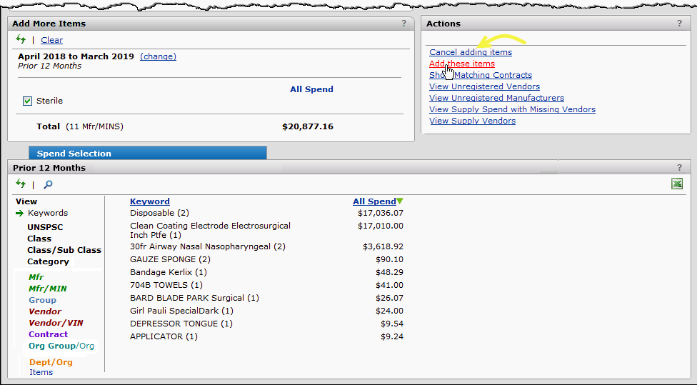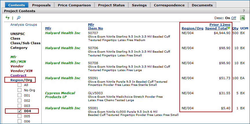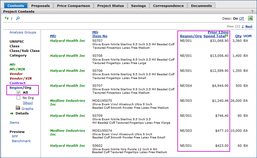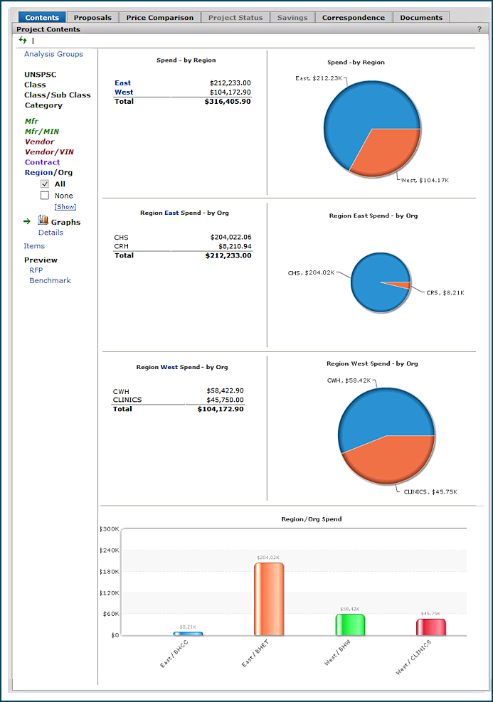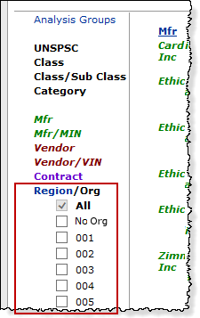 - Identify and examine segments of spend in terms of manufacturer, manufacturer/MIN, vendor, vendor/VIN, contract, item keywords, UNSPSC codes, and others. The Region/Org filter lets you work with spend for affiliate organizations.