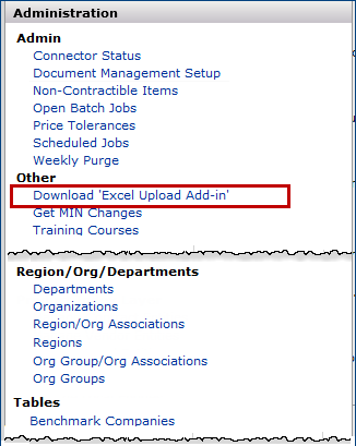 - From the Administration > Other menu, select Download 'Excel Upload Add-in' (Figure 1).