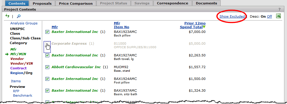 Note: If you wish to remove a downloaded item from the project, you must exclude it using the link in the Mfr/MIN view. (See Excluding Items for details.)