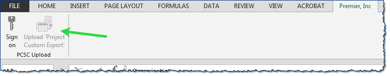 - Upload the XLS file using the Upload 'Project Custom Export' button on the add-in tab in Excel (green arrow, Figure 120).