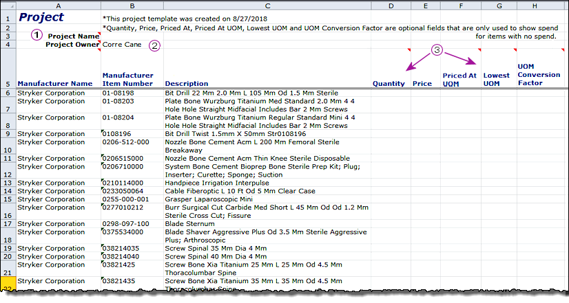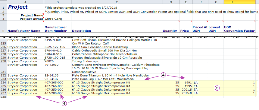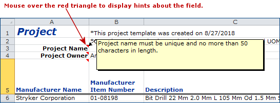 - For details on entering item information, see Editing the Project Template Spreadsheet.
