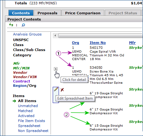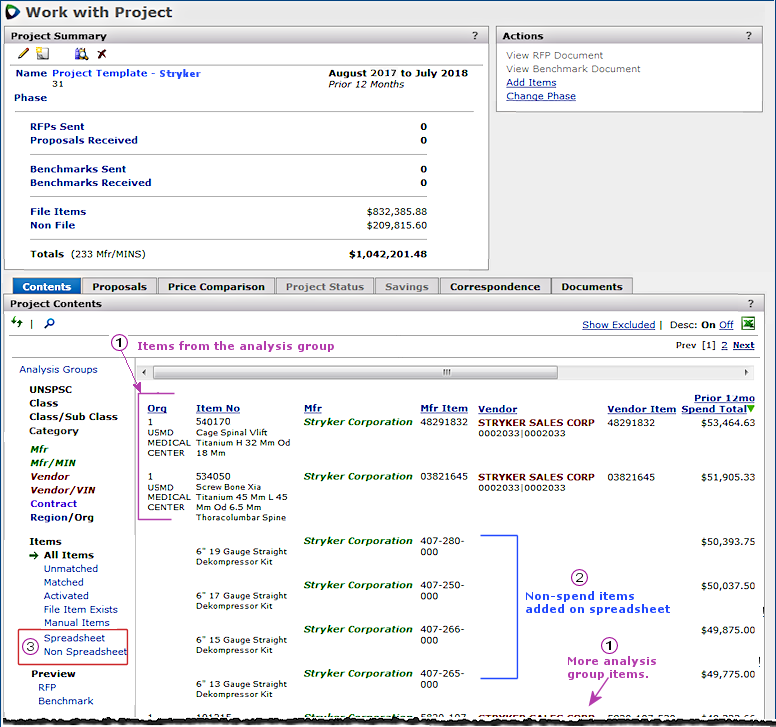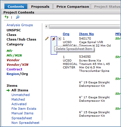 In some cases, additional items may appear in the project as a result of the process that the system uses to get all matching spend items. When a project is created from a spreadsheet, the filters Spreadsheet (and possibly Non Spreadsheet) are available in the Items view. You can filter the list of items for only items that were included on the spreadsheet upload (Spreadsheet), or only items that were included by the system (Non Spreadsheet).