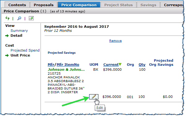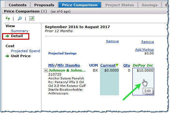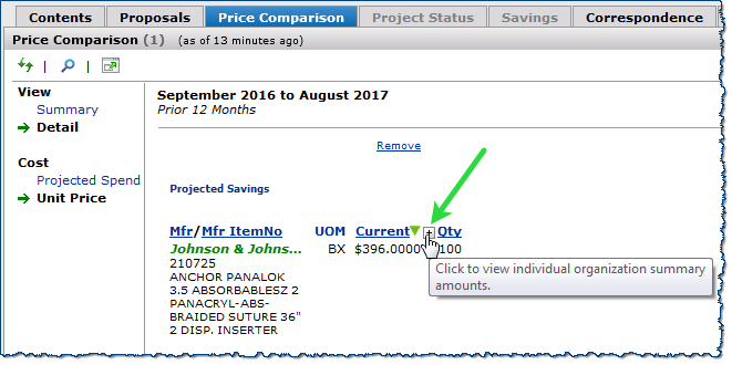Custom projects created using the new Custom Export feature display the current price of items for each Org in the Current (Current Price) column under the Detail view on the Price Comparison tab. You can edit the Current Price and Quantity fields for each item on this tab, and your changes are reflected on the Contents tab.
