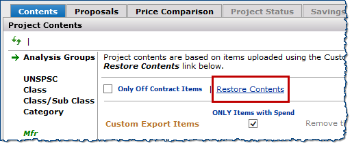 A project with item data that has been modified using the Custom Export feature can be restored to its original list of items using the Restore Contents link. The project items are returned to the starting point based on the original Analysis Groups that were used to initially create the project.