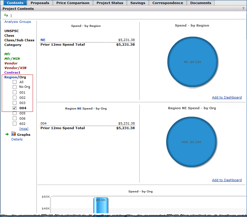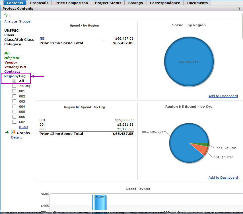 - Review spend by organization, including graphs of spend dollars by organization and region.