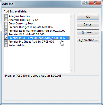 If you are installing a new Excel add-in from a new Sourcing and Contract Management Service Pack, disable (by unselecting) the old add-in that you are currently using. The instructions below explain how to install, enable, and disable an Excel add-in.