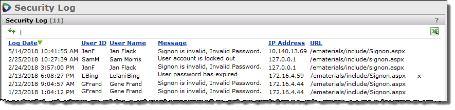 | Security Log | Location: Administration contents > User/Security Settings Menu Lists invalid sign-on attempts. |