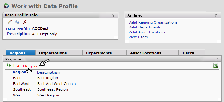 Authority: To modify region, organization, or department tables, the user's "CATables" role object must be set to Modify, at a minimum.