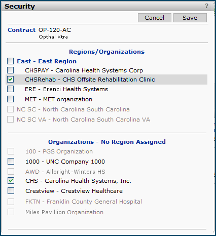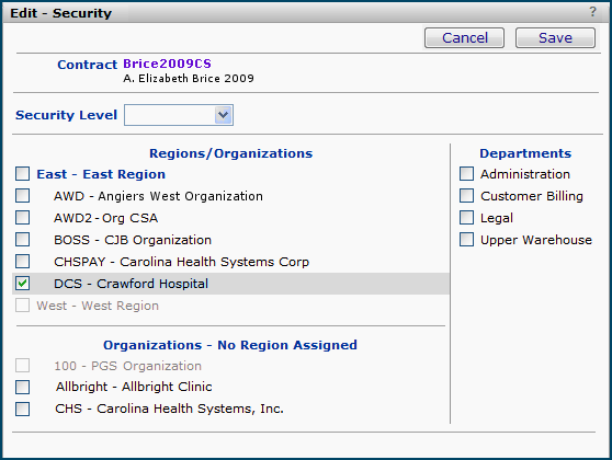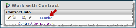 ContractSecurity (supply contracts) - The Contract Security feature lets you identify the organizations/regions whose users are allowed to view the contract. The list of organizations/regions is displayed when you click the Contract Info panel's Security link (Figure 8). Details about the contract security feature are in the subsequent section Restrict user access to a contract.
