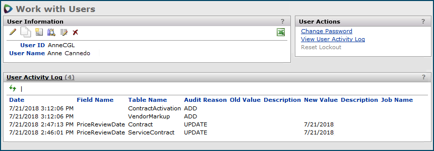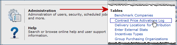 | Contract Price Activations Log | Location: Administration contents > Tables menu - The Contract Price Activations Log is a single, searchable list of price activations for all contracts. - For individual contracts, on the "Work with Contract" page Actions panel, click View Contract Price Activations Log to display activated/deactivated items, dates, and prices for the contract. |