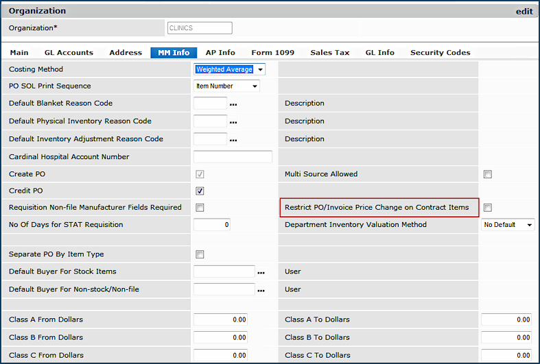 For hospitals with Materials Management, price changes to contract items on a purchase order, or during invoice matching -- clearing a price exception -- can be restricted for individual users, organizations, and entire hospitals. The restriction forces payment of an invoice at the PO price.