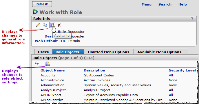 Links to audited fields for roles are located on the "Work with Role" page, Figure 34.