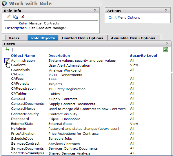 Users in different roles may have different levels of access set for the same role object, depending on their jobs. The Administrator assigns a security level to the various role objects in a user's role. The Security Level column in Figure 4 displays the settings. Security levels from greatest to least scope are: