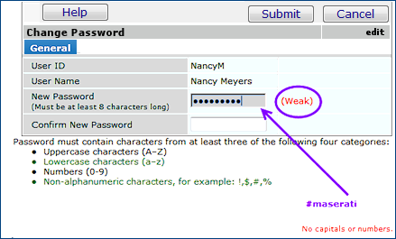 In Figure 30, the user has capitalized "M." This password is strong, and the system will accept it. The user could also have entered: "#8Maserati," which would be even stronger.