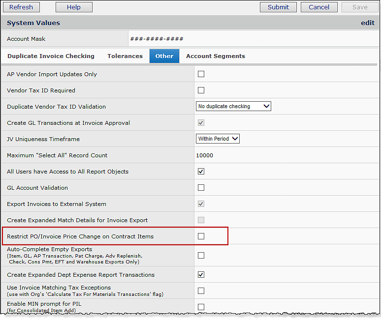 - If the restriction field is selected in System Values, no one at the site can change a PO price for a contracted item.
