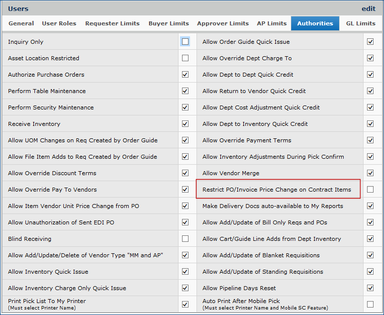 - If the restriction is not selected, users in the organization -- who are not restricted individually -- can change contract item prices in purchase orders and invoices.