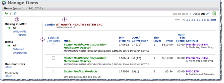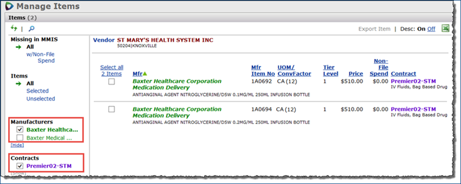 The filters for the list are Missing in MMIS (All / with Non-File Spend), Items, Manufacturers, and Contracts.