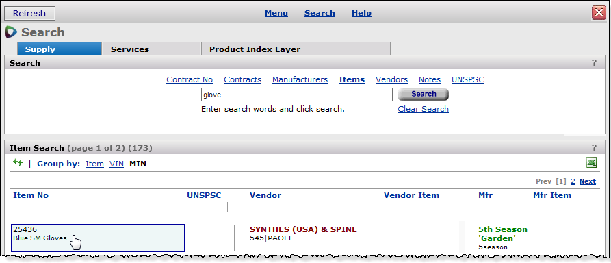 - Locate the item information using the Search box set to Items. Figure 22 is a search for an item containing "glove" in its description.