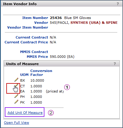 A contract can price an item for a UOM that is not in the MMIS item record. Or, an item record may contain a UOM that is the same as the contract UOM, but with a different conversion factor. To align the item record with pricing UOMs in one or more contracts, you can manually create new UOMs for items so that they match contract UOMs. You can also edit Standard UOM conversion factors for item records.