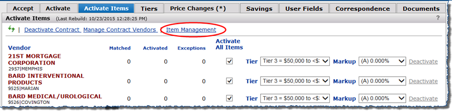 - Click Item Management if you wish to manage the items for the new vendor you just added, and follow the instructions in the Managing Unmatched Contract Items from the List of All Vendors section.