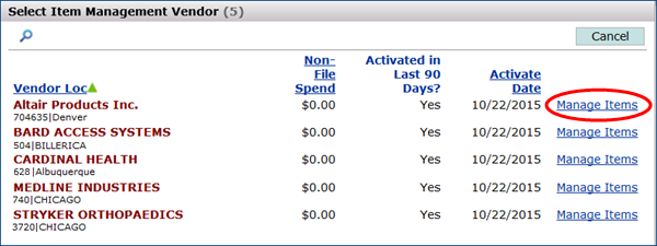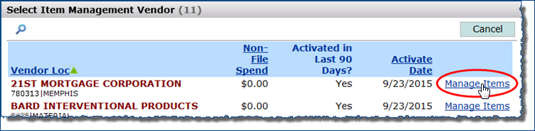 - The Select Item Management Vendor panel opens with a list of vendors. Click Manage Items next to the vendor of interest. (Figure 17)