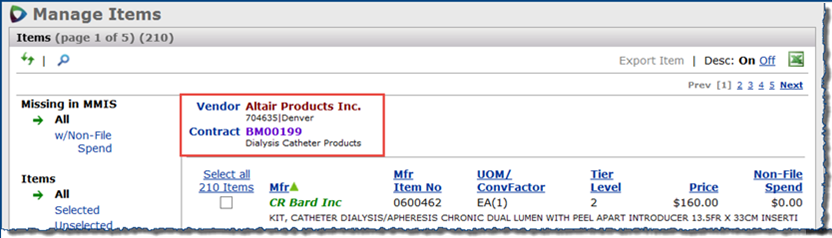 - Note: This "Manage Items" page includes the contract at the top of the page, since all the unmatched items belong to the same contract. If an item is matched for a contract vendor, but unmatched for other contract vendors, the item will appear for each of the other vendors as unmatched.